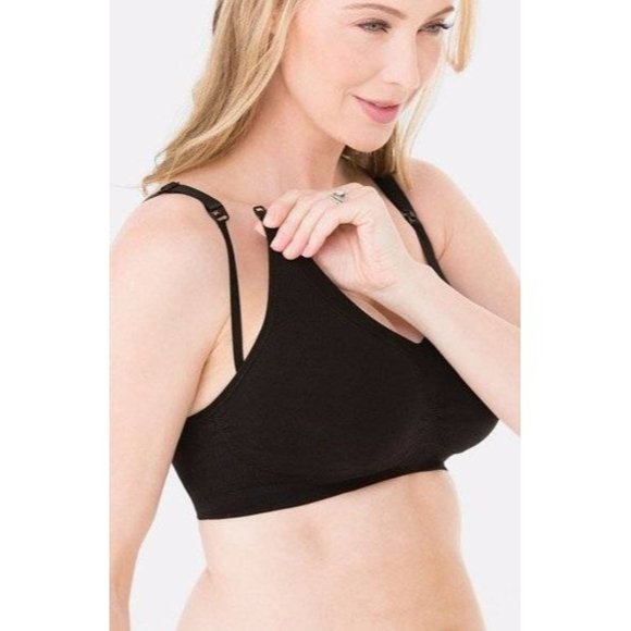 A soft, supportive nursing bra is designed with a smooth, clasp-free back and convenient drop cups. The quick-release clasps can easily be unclipped with one hand for simple, easy nursing.