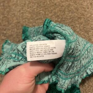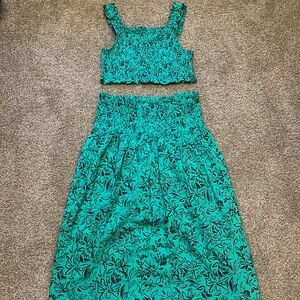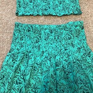 Vibrant turquoise crop top and skirt with touched, stretchy waist and bust. Incredibly comfortable and with the stretch, it’s practically one-size-fits-all. Incredibly excellent used condition.
