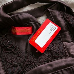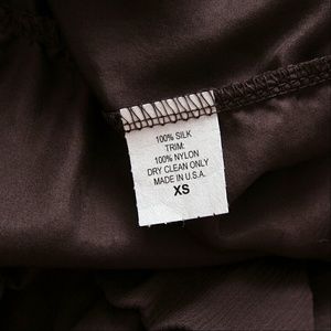 New with tags! This is a beautiful mahogany brown chiffon silk halter dress by Ingwa Melero! It has a tiered empire skirt, a low-cut neckline that is embellished with embroidered lace and charmeuse silk that wraps under the bust and and extends into crisscross straps at the back. It cinches at the waist over a keyhole at the back of the waist to flatter the waistline. It is 32" long and 12.5" across the underbust.