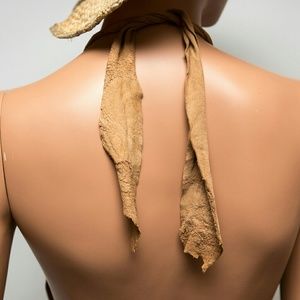 I have for sale an incredibly unique and amazing suede leather halter top by NYC designers, Ingwa Melero. It is made of a suede that is luxuriously soft. It has a raw bottom edge and crochet flower cut-outs in the bottom. The suede straps tie behind the open back and the neck, giving it a very adjustable fit. It is doubtful that this piece will ever be seen again, given that it was a very limited run. Look sexy, daring, and controversial in one go!