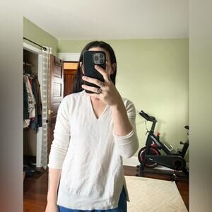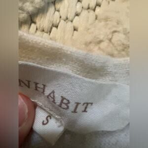 Cozy cashmere sweater by inhibit. Cream in color. V neck with 3/4 length sleeves. Button detail along the side. Rolled hem. Some mild pilling along side but nothing major. I am 5’5” and usually wear XS/S for reference.