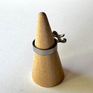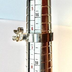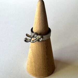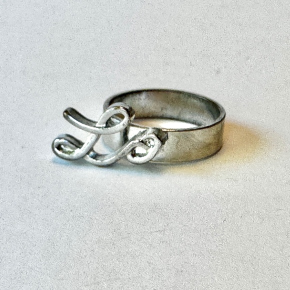 GUC. Here'a a pre-owned ring featuring a cursive capital letter "L." The size is approx. 6 1/2 and it's not adjustable. The finish is worn in some areas from age and use; please see all photos. The metal is unmarked but polishes like silver, so my guess is this is silver-plated. Notice how the L design extends to the left of the ring!
