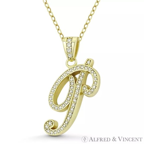 The featured pendant is cast in .925 sterling silver and showcases a cursive script initial "P" design paved w/ cubic zirconia crystals. The pendant is then finished with a sturdy bail that will accommodate most standard chains and plated with 14k yellow gold.