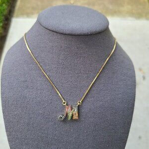This is a stylish gold necklace featuring a delicate chain and a colorful pendant shaped as the letter "M." The pendant is adorned with multicolored gemstones, each segment showcasing a unique color, including pink, green, orange, and blue, adding a vibrant and playful touch to the piece.