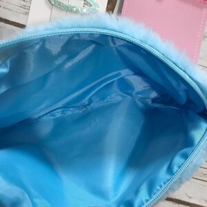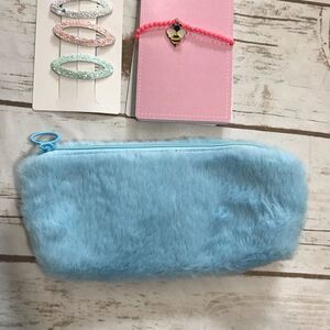 Faux fur monogram P zipper pouch with mini notebook, bee bracelet and hair clips