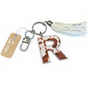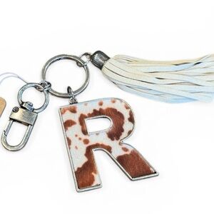 Monogram 'R' cowhide keychain with leather tassel. Metal hardware and clip for easy attachment. Trendy cow print accent in warm tones.