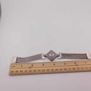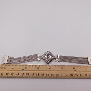 Monet initial "R" bracelet. Multi silvertone metal chain and hammered metal accented with R surrounded by rhinestones. Length is 7.5 inches with magnetic clasp.