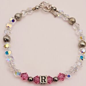 Initial "R" Pink and Clear AB Glass Beads with Silvertone 7.5" Bracelet