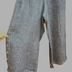 Inizio Italy presents size small, blue/gray linen cropped pants. Features chic buttons and a wide leg style for a beachy, flowy look. Ideal for the modern woman.