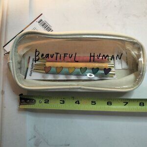 Stylish, clear pen and pencil case featuring the phrase "Beautiful Human" and includes three pens with black ink.