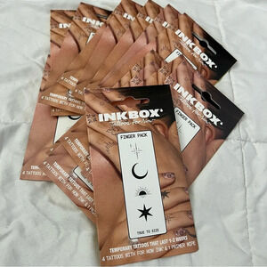 Two pack of brand new unopened Inkbox Finger Temporary Tattoos! Each pack has four finger tattoos with For Now Ink and a primer wipe. One is an astronomy / astrology set with sun, moon, and stars, the other is a fun pack with a diamond gem, fire flame, butterfly, and rose flower.