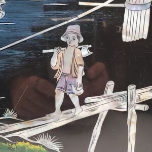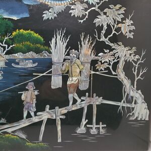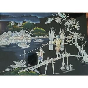 This beautiful Asian artwork is a unique piece that showcases the beauty of nature, animals, agriculture, and different cultures. The artwork is made using an intricate inlay technique on a black lacquered wood base, making it a stunning addition to any collection. The medium-sized artwork measures 12x16 inches and features a stunning mosaic design made from shells. The artist is unknown, but their skill and creativity shine through in this amazing piece. Add this vintage artwork to your collection today and enjoy its beauty for years to come.