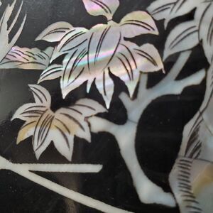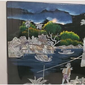 Inlaid Asian Artwork Shell On Black Lacquered Wood Vintage 12x16 Inches