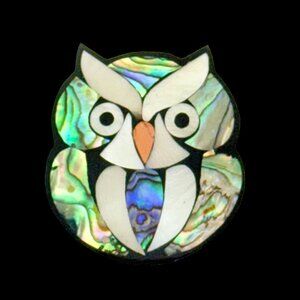 Inlaid shell owl brooch. Shells are abalone and mother of pearl. The brooch size is approx. 1.5" x 1.25". Very good overall condition. The pin stem secures with a rollover catch. Most likely Lee Sands/Unsigned.