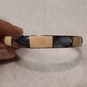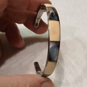 This pretty bracelet features blue/gray abalone and ivory shell rectangles inlaid into a silver cuff. Ships from a smoke free home.
