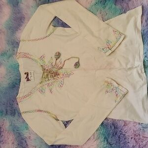 cute long sleeve shirt with embroidery. this one has a spot on the front because it's been unwrapped and used for measurements. I have 8 more size medium that are new in packaging with no spots on them or flaws. and one XL . see photos for measurements Brand runs smal