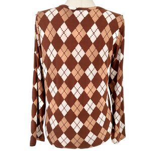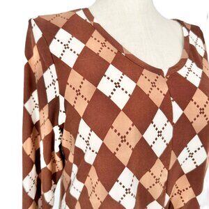 Inner Circle Blouse Womens XL Brown Argyle Print Soft Stretchy Long Sleeves