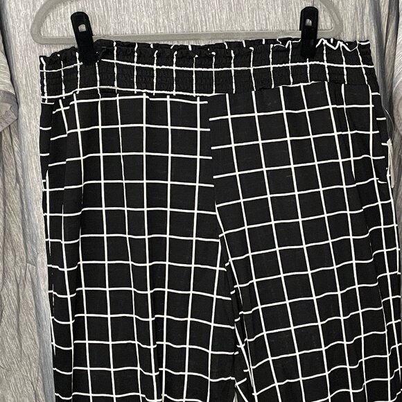 Wide leg pants, black with white plaid, inseam is 27 in., so more of an ankle/crop pant. Very lightweight, would be great for the beach! It is very thin material, you could wear over swimsuit, and even dress it up later in the evening for dinner, with a cute pair of sandals. 97% Poly/3% Spandex. It is sized at a 1X, but has an elastic waist, and wide legs, so could fit a 2X.