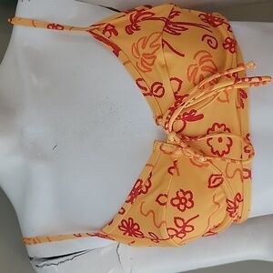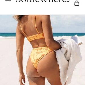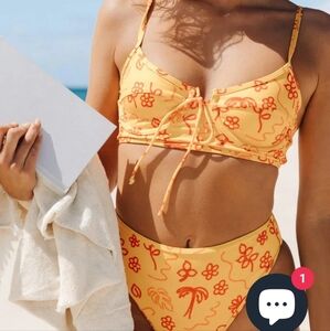 This vibrant bikini set features a playful floral print in yellow and red. Perfect for a sunny day at the beach or poolside lounging. High Waisted bikini bottoms cropped shilouette bikini top with wire adjustable straps sold at free People vacation resort party beach
