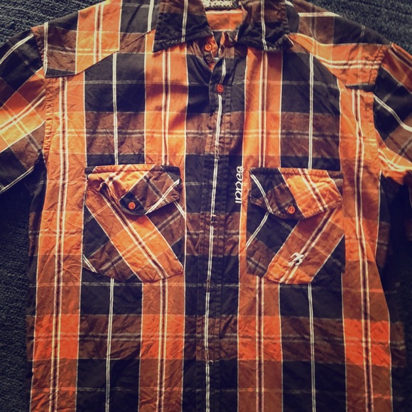 65/35 cotton/poly, Short sleeve woven with custom yarn dye plaid, custom chest pocket, damask woven labels and tonal embroideries