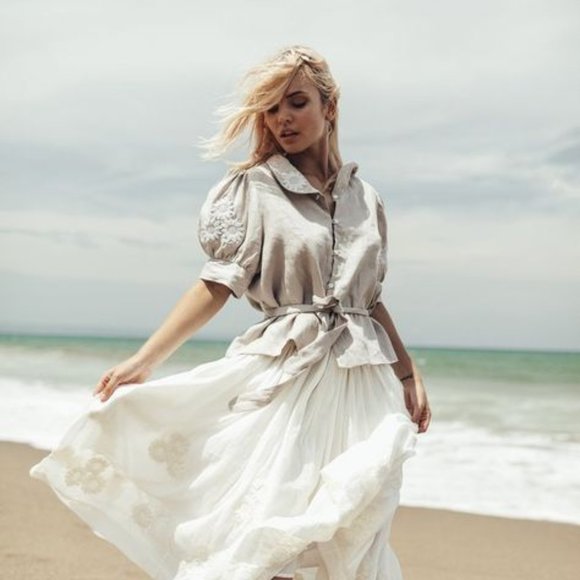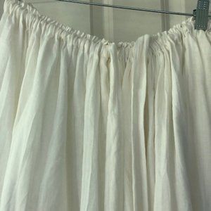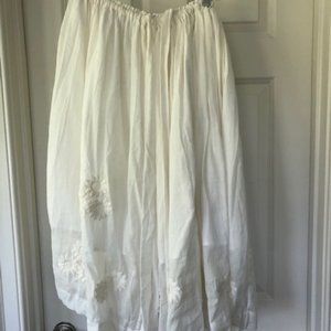 White cotton with beautiful embroidery. New, never worn. There is one flower with slight red stitching (please see photos; it's not a stain). Adjustable waist with ties. This is a size 2, but would fit US sizes 4--10). Length is 30". I have seen pictures of this skirt worn as a dress.