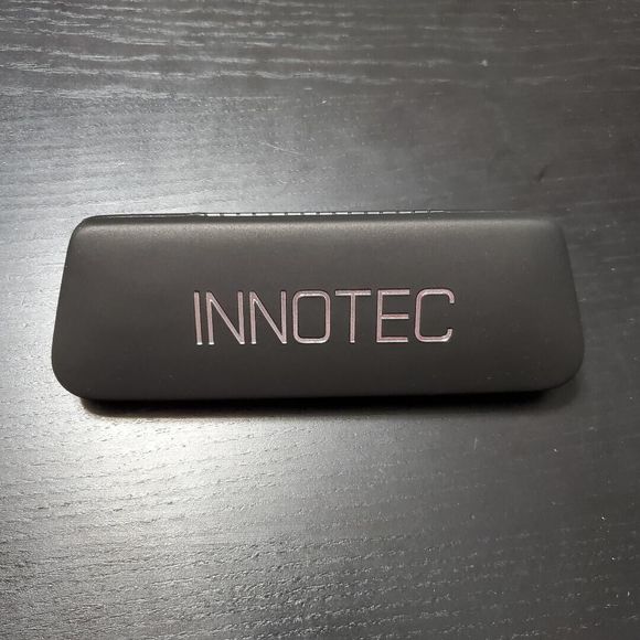 New Innotec premium hard clamshell eyeglass storage case and microfiber cleaning cloth. Constructed of durable plastic with a smooth feel case. Black case outside with black felt lining on the inside. Snap close to ensure a tight seal. Measures out 6 and 3/8 inches long by 2 and 1/4 wide by to 2 and 3/4 inches height.. Great for storing standard size glasses,sunglasses and reading glasses. Not recommended for oversize glasses as they will not fit. Sharp looking case with the silver logo on the outside and inside.
