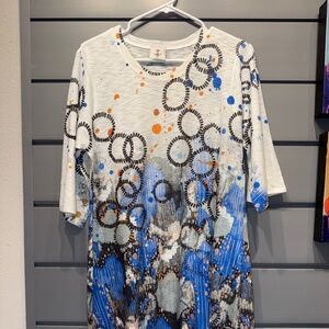 Scoop neck band top with asymmetrical hem and three-quarter sleeve. Super comfy to wear and made in the USA!