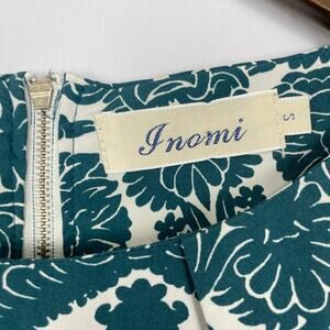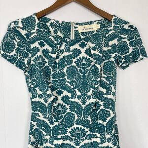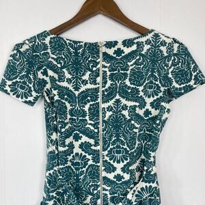 Inomi Teal & White Damask Print Pleated Knee Length Dress