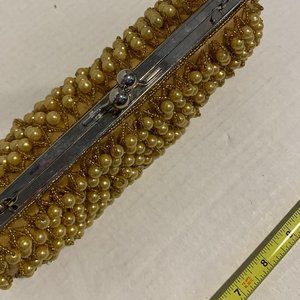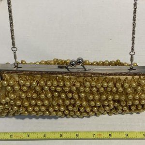 Fabulous In's swinging bead evening bag, purse, gold faux pearls & seed beads with detachable & adjustable chain for conversions, can even be clutch, silvertone kiss lock closure & frame, satin lined, large main compartment, 1 slip pocket, measures approximately 10" X 4" X 2" with 48" silvertone chain. In extremely well cared for condition, was used only one. Will promptly ship with care alongside a 100% guarantee.