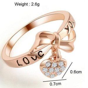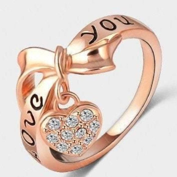 This 18k rose gold plated ring is ready to ship. It fits a size 7 / size 8 and has the inscription "LOVE YOU" in black enamel on the ring. The heart shaped locket charm has Austrian Crystals on it.