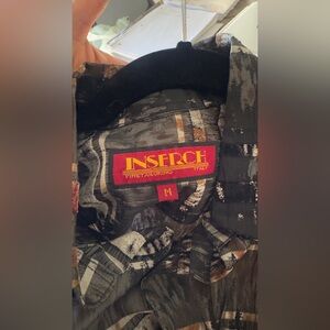 Unique shirt with an abstract pattern. Features shades of black, brown, and gray.