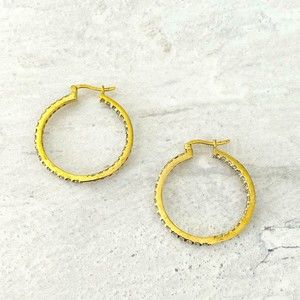 Beautiful inside out or in out hoop earrings in rich gold over sterling silver set with round cut CZ crystals. The hoops are 1 1/4" in diameter and 2 mm wide.