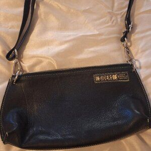 Appears to be leather. Amsterdam canal scene on front. Black back with Insiders 1 logo. Size: 12" w x 6.25" H. Strap: 25" folded in half, detachable