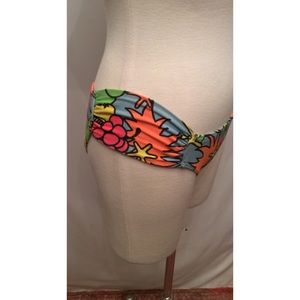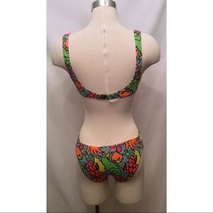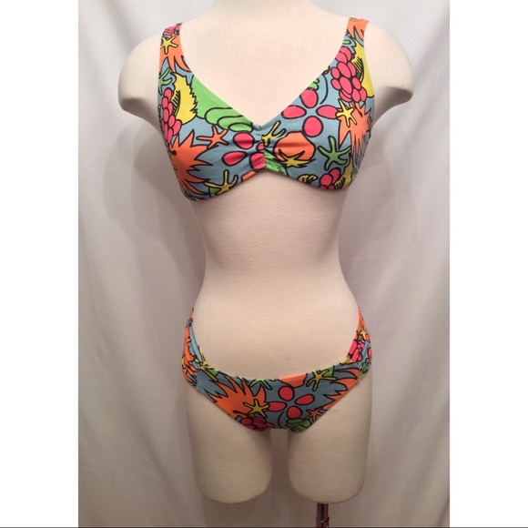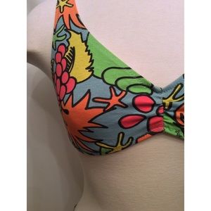 Really colorful and fun 80s looking print. Fabric has a cotton feel. Pull on bottoms and clasp back top.