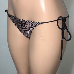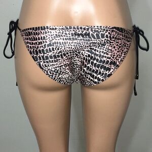 I love the print on these beautiful bottoms! Pair of them with a black top and it would look great. Super sexy cut. Fully lined. String ties on the side with smoky silver accent. They are black and what I would call a dusty peach. Beautiful color. The style is called string bikini gator pink. Looks a little like a alligator print