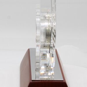 Persistence Crystal Inspirational Desk Clock with Mahogany Finish Wood Base measures 6.69”l x 5.59”w c 4.09”h. Batteries included.
