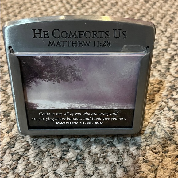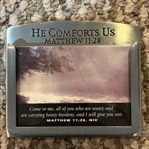 Decorative photo frame featuring Matthew 11:28. Elegant design with a comforting message.
