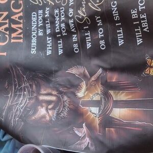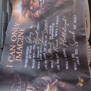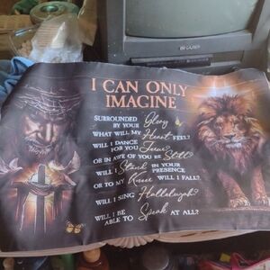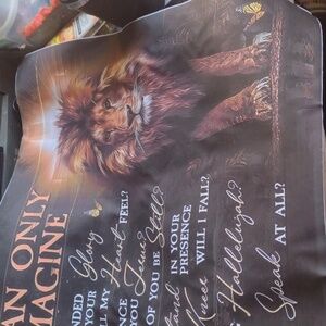 Beautiful tapestry featuring a lion and Jesus. Inspirational text included. Perfect for spiritual decor.