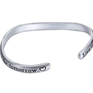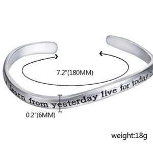 Quote: Live the life you love. Learn from yesterday. Live for today. Hope for tomorrow. 2 clear crystals on bottom of cuff.