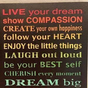 Inspirational canvas wall hanging is black with multiple colors. Stapled on wooden frame. New condition. Length is 24”. Width is 12”. New condition.