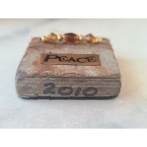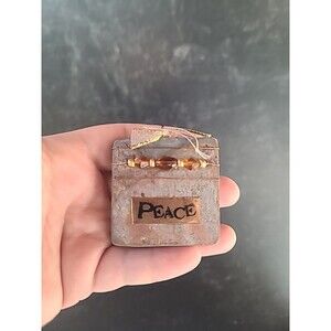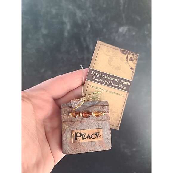 This is a square shaped stone ornament with product card, beaded adornment, and "Peace" logo.