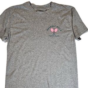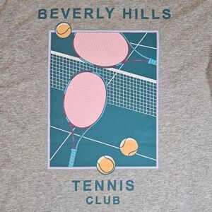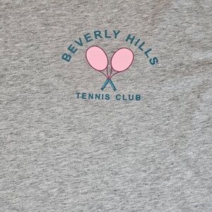 Front chest features 'Beverly Hills Tennis Club' with crossed pink tennis rackets.