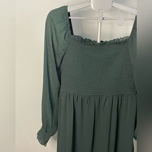 Elegant dark green dress with smocked bodice and long sleeves. Perfect for any occasion.