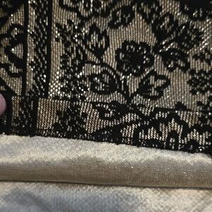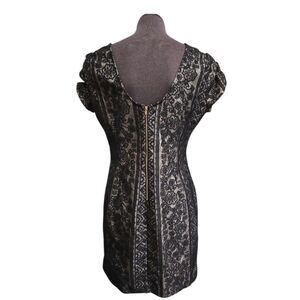 This elegant gold and black mini sheath dress features short puff sleeves and a stylish crew neck. Crafted from delicate lace, it showcases a beautiful floral pattern, making it an ideal choice for a cocktail event. Chest:18.5" from armpit to armpit. Waist:15.5" from side to side. Hips:17.5" from side to side. Length:25.5" from the armpit down. Smoke-free, pet-free home.