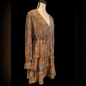 Chic long sleeve dress with paisley design. Features a flattering wrap style at the bust with a tiered skirt. Ideal for versatile wear. So cute!
