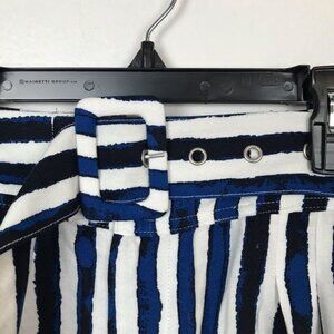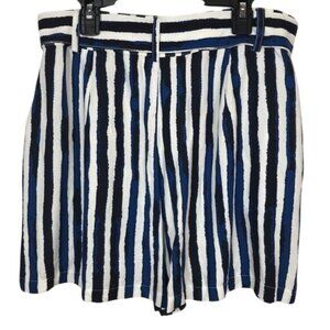 Stylish large blue shorts with vertical stripes and a trendy belted design, perfect for a chic summer look. New with tags, these shorts offer a comfortable fit and fashionable appeal.