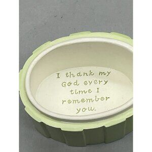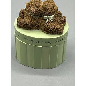 This charming Inspirio oval box features a heartwarming bear hug design, perfect for your sister. A collectible piece from 2002, it adds a touch of nostalgia and warmth to any space. The green color and bow accents make it a delightful gift.