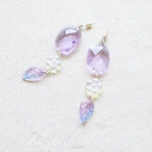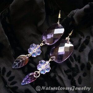 This pair of extra long and voluminous danglers is right at the 3" mark. It's all about bling, glam, shimmer and iridescent shine. Starting at the top with stainless steel posts, followed by pale lavender, huge faceted glass rectangle cushions, an iridescent clear pressed glass flower, and ending with lilac colored pressed glass leaves.