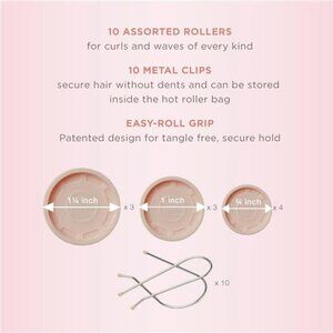This compact hot roller set includes 10 rollers in 3 sizes for voluminous curls and waves. Comes with a heat-resistant pouch for easy travel and 10 metal pins for a secure hold, making it perfect for styling on the go.