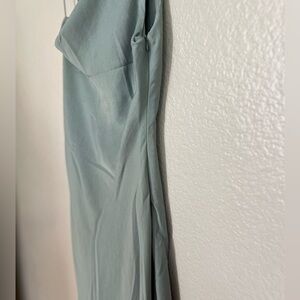 Lulus Instant Impression Sage Green Asymmetrical Midi Dress makes an impression that lasts! Sleek woven fabric creates a cowl neckline that drapes down from an adjustable spaghetti strap and a wide tank strap. A column silhouette flows to an asymmetrical midi skirt for a stunning finish! Hidden side zipper/hook clasp.